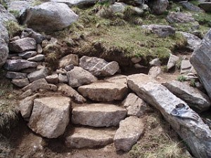 Unfortunately, the Half Moon Pass Route is in bad shape, especially above tree line where erosion and numerous braids have led to a confusion of social trails which can lead climbers in the wrong direction off trail, especially on the descent. This is where we concentrated our work efforts. We spent our time building structures to check erosion on the trail and clearly define a sustainable route up the mountain. These included check steps (set across the trail to hold back soil) of various sizes, sets of stairs, water bars for drainage, and rip rap (piled rock to deter hikers) to close out braids and social trails.