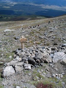After sufficiently covering both the top and bottom junctions of the trail scar, we continued to plant grass plugs in the trail and build check dams at the particularly steep sections. This one-two restorative punch will hopefully prevent erosion and bring back the youthful complexion of the mountain’s natural tones.